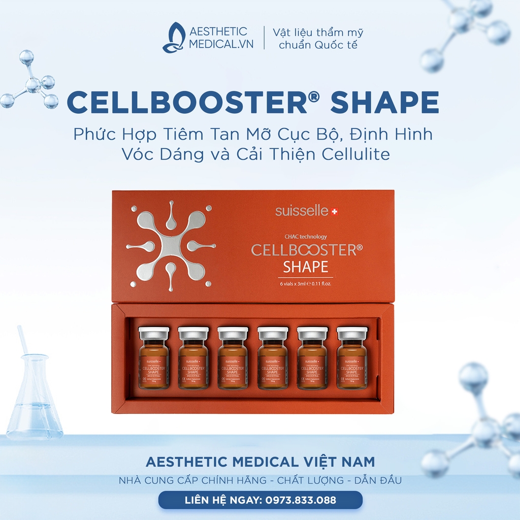 CELLBOOSTER® SHAPE là một phức hợp tiêm định hình và giảm mỡ cục bộ (Hyaluronic Acid Reshaping Complex), được sản xuất bằng Công nghệ CHAC đã được cấp bằng sáng chế. Đây là một dung dịch tiêm vô trùng, không màu, trong suốt, được thiết kế để giảm tích tụ mỡ cục bộ (local fat accumulation) và cải thiện tình trạng sưng phù, cellulite.