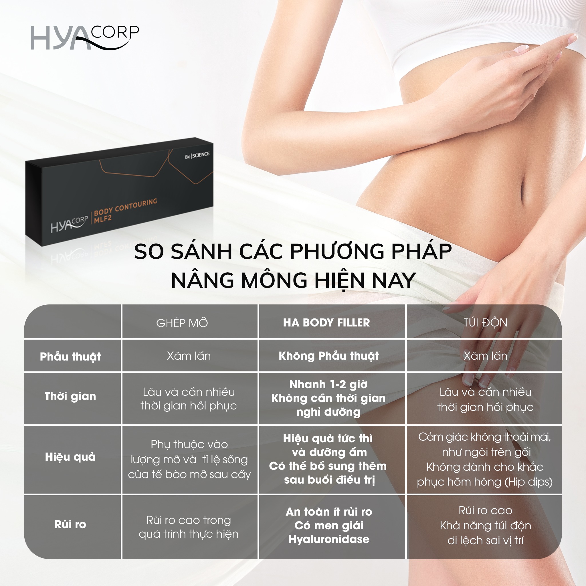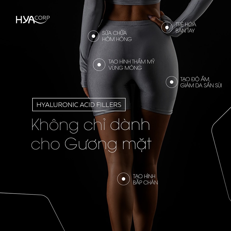 - HYAcorp – Chất làm đầy Hyaluronic Acid từ Châu Âu có chứng nhận và chỉ định từ CE đầu tiên tại Việt Nam, dành riêng cho tạo hình và trẻ hóa cơ thể, phục hồi thể tích, tạo đường viền ở các vùng như mông, bắp chân, bàn tay, cũng như chỉnh sửa các dị tật lõm khác một cách tự nhiên, an toàn, không cần thời gian nghỉ dưỡng.