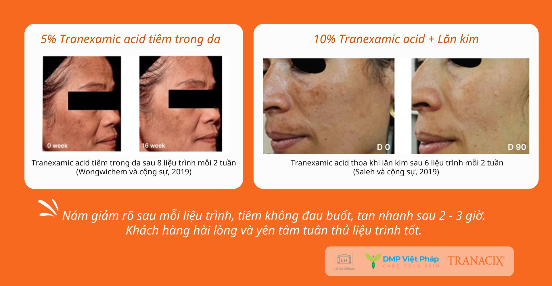 TRANEXAMIC ACID hiệu quả trong việc điều trị nám. Bao gồm cả nám da do mang thai (tăng sắc tố da do nội tiết) và PIH (tăng sắc tố da sau viêm).